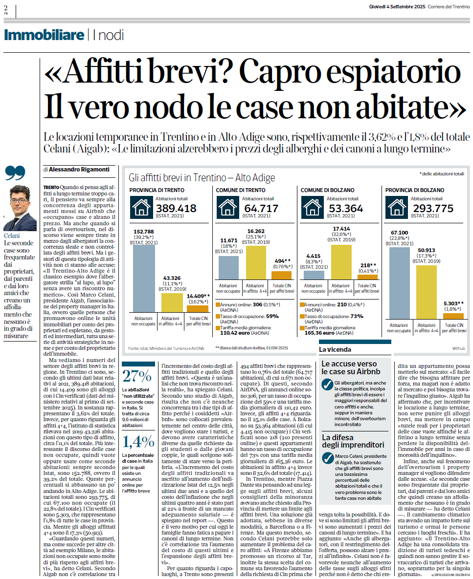 Qualche passaggio dell’articolo: “La correlazione tra l’incremento del costo degli affitti tradizionali e quello degli affitti brevi? É un’analisi che non trova riscontro nella realtà” ha spiegato Marco Celani. Secondo uno studio di Aigab, risulta che non c’è neanche concorrenza tra i due tipi di affitto perché gli affitti brevi sono collocati prevalentemente nel centro delle città, dove vogliono stare i turisti, e devono avere caratteristiche diverse da quelle richieste dagli studenti o dalle giovani coppie, che scelgono solitamente di stare verso la periferia. «L’incremento del costo degli affitti tradizionali va ascritto all’aumento dell’indicizzazione Istat del 12,5% negli ultimi due anni e a quello del costo dell’inflazione che negli ultimi quattro anni è stato pari al 22% a fronte di un mancato adeguamento salariale — è spiegato nel report —. Questo è il vero motivo per cui oggi le famiglie fanno fatica a pagare i canoni di lungo termine. Non c’è correlazione tra l’aumento del costo di questi ultimi e l’espansione degli affitti brevi».