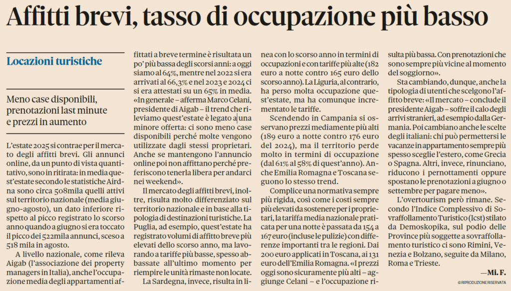 L’estate 2025 si contrae per il mercato degli affitti brevi. Gli annunci online, da un punto di vista quantitativo, sono in ritirata: in media quest’estate secondo le statistiche Airdna sono circa 508mila quelli attivi sul territorio nazionale (media giugno-agosto), un dato inferiore rispetto al picco registrato lo scorso anno quando a giugno si era toccato il picco dei 522mila annunci, sceso a 518 mila in agosto. A livello nazionale, come rileva Aigab (l’associazione dei property managers in Italia), anche l’occupazione media degli appartamenti affittati a breve termine è risultata un po’ più bassa degli scorsi anni: a oggi siamo al 64%, mentre nel 2022 si era arrivati al 66,3% e nel 2023 e 2024 ci si era attestati su un 65% in media. «In generale – afferma Marco Celani, presidente di Aigab – il trend che rileviamo quest’estate è legato a una minore offerta: ci sono meno case disponibili perché molte vengono utilizzate dagli stessi proprietari. Anche se mantengono l’annuncio online poi non affittano perché preferiscono tenerla libera per andarci nei weekend». Il mercato degli affitti brevi, inoltre, risulta molto differenziato sul territorio nazionale e in base alla tipologia di destinazioni turistiche. La Puglia, ad esempio, quest’estate ha registrato volumi di affitto breve più elevati dello scorso anno, ma lavorando a tariffe più basse, spesso abbassate all’ultimo momento per riempire le unità rimaste non locate. La Sardegna, invece, risulta in linea con lo scorso anno in termini di occupazioni e con tariffe più alte (182 euro a notte contro 165 euro dello scorso anno). La Liguria, al contrario, ha perso molta occupazione quest’estate, ma ha comunque incrementato le tariffe. Scendendo in Campania si osservano prezzi mediamente più alti (189 euro a notte contro 176 euro del 2024), ma il territorio perde molto in termini di occupazione (dal 61% al 58% di quest’anno). Anche Emilia Romagna e Toscana seguono lo stesso trend. Complice una normativa sempre più rigida, così come i costi sempre più elevati da sostenere per i proprietari, la tariffa media nazionale praticata per una notte è passata da 154 a 167 euro (incluse le pulizie) con differenze importanti tra le regioni. Dai 200 euro applicati in Toscana, ai 131 euro dell’Emilia Romagna. «I prezzi oggi sono sicuramente più alti – aggiunge Celani – e l’occupazione risulta più bassa. Con prenotazioni che sono sempre più vicine al momento del soggiorno». Sta cambiando, dunque, anche la tipologia di utenti che scelgono l’affitto breve: «Il mercato – conclude il presidente Aigab – soffre il calo degli arrivi stranieri, ad esempio dalla Germania. Poi cambiano anche le scelte degli italiani: chi può permettersi le vacanze in appartamento sempre più spesso sceglie l’estero, come Grecia o Spagna. Altri, invece, rinunciano, riducono i pernottamenti oppure spostano le prenotazioni a giugno o settembre per pagare meno». L’overtourism però rimane. Secondo l’Indice Complessivo di Sovraffollamento Turistico (Icst) stilato da Demoskopika, sul podio delle Province più soggette a sovraffollamento turistico ci sono Rimini, Venezia e Bolzano, seguite da Milano, Roma e Trieste.